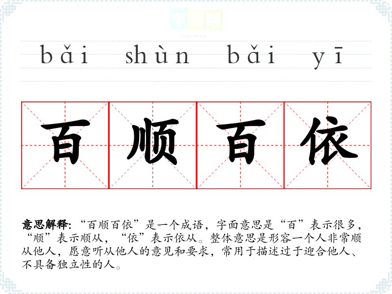 “百顺百依”是一个成语,字面意思是“百”表示很多,“顺”表示顺从,“依”表示依从。整体意思是形容一个人非常顺从他人,愿意听从他人的意见和要求,常用于描述过于迎合他人、不具备独立性的人。