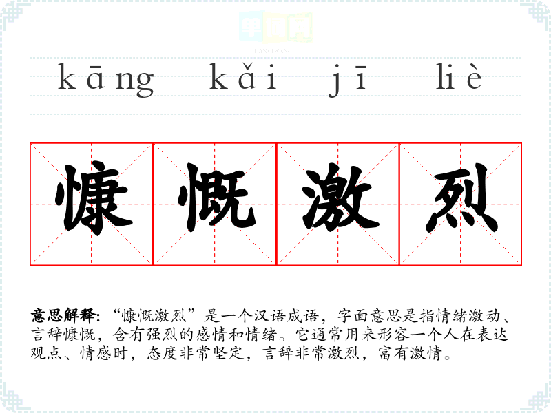 “慷慨激烈”是一个汉语成语,字面意思是指情绪激动、言辞慷慨,含有强烈的感情和情绪。它通常用来形容一个人在表达观点、情感时,态度非常坚定,言辞非常激烈,富有激情。