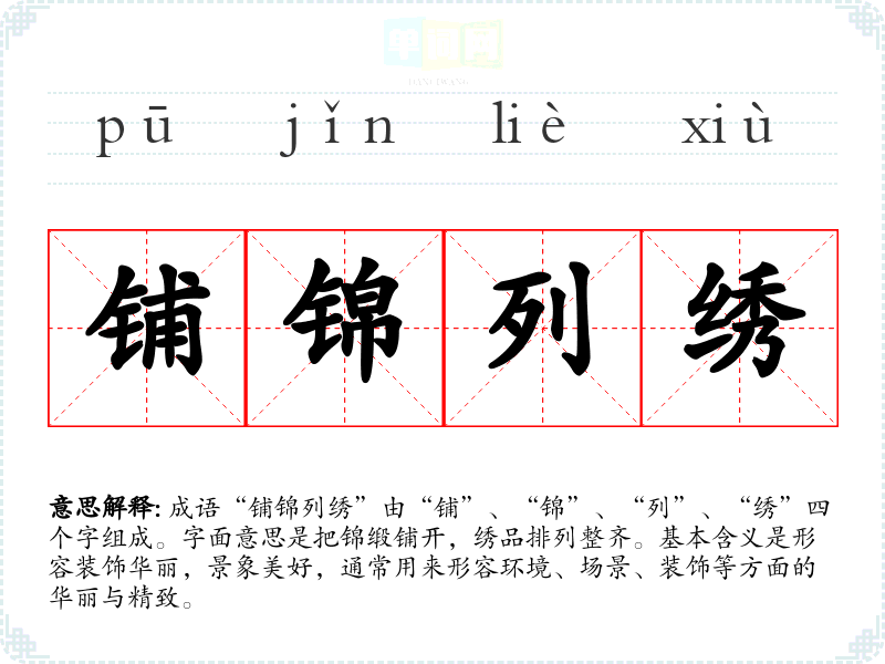 成语“铺锦列绣”由“铺”、“锦”、“列”、“绣”四个字组成。字面意思是把锦缎铺开,绣品排列整齐。基本含义是形容装饰华丽,景象美好,通常用来形容环境、场景、装饰等方面的华丽与精致。