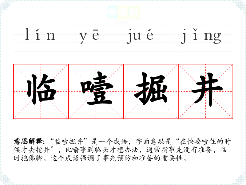 | 临渴掘井 | 到口渴才掘井。比喻事先没有准备,临时才想办法。 |
