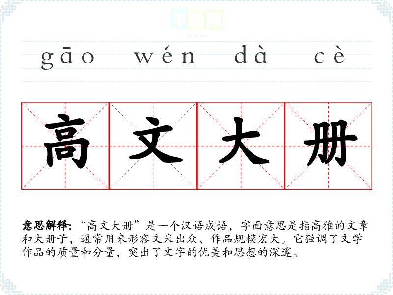“高文大册”是一个汉语成语,字面意思是指高雅的文章和大册子,通常用来形容文采出众、作品规模宏大。它强调了文学作品的质量和分量,突出了文字的优美和思想的深邃。