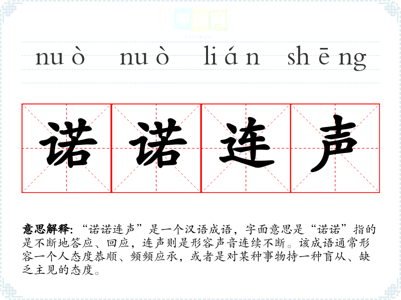 “诺诺连声”是一个汉语成语,字面意思是“诺诺”指的是不断地答应、回应,连声则是形容声音连续不断。该成语通常形容一个人态度恭顺、频频应承,或者是对某种事物持一种盲从、缺乏主见的态度。