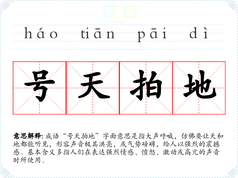成语“号天拍地”字面意思是指大声呼喊,仿佛要让天和地都能听见,形容声音极其洪亮,或气势磅礴,给人以强烈的震撼感。基本含义多指人们在表达强烈情感、愤怒、激动或高亢的声音时所使用。