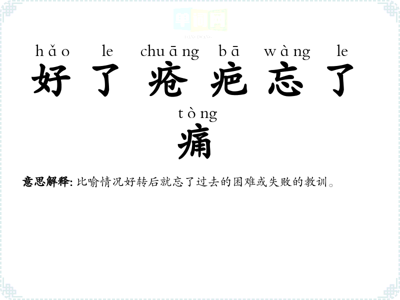 | 好了疮疤忘了痛 | 比喻情况好转后就忘了过去的困难或失败的教训。 |