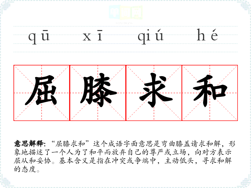 “屈膝求和”这个成语字面意思是弯曲膝盖请求和解,形象地描述了一个人为了和平而放弃自己的尊严或立场,向对方表示屈从和妥协。基本含义是指在冲突或争端中,主动低头,寻求和解的态度。