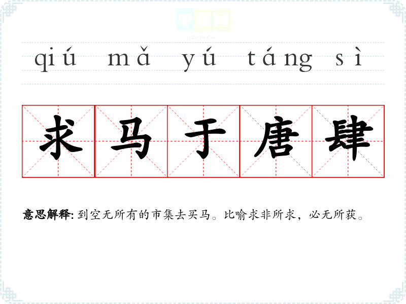 | 求马唐肆 | 唐:原指无壁之屋,引伸为空的;肆:铺子,这里指卖马的地方。到不是停马处去找马。比喻在什么也没有的地方寻求自己所需的东西。 |