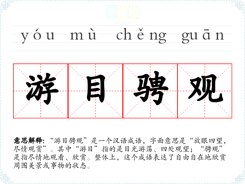 “游目骋观”是一个汉语成语,字面意思是“放眼四望,尽情观赏”。其中“游目”指的是目光游荡、四处观望;“骋观”是指尽情地观看、欣赏。整体上,这个成语表达了自由自在地欣赏周围美景或事物的状态。