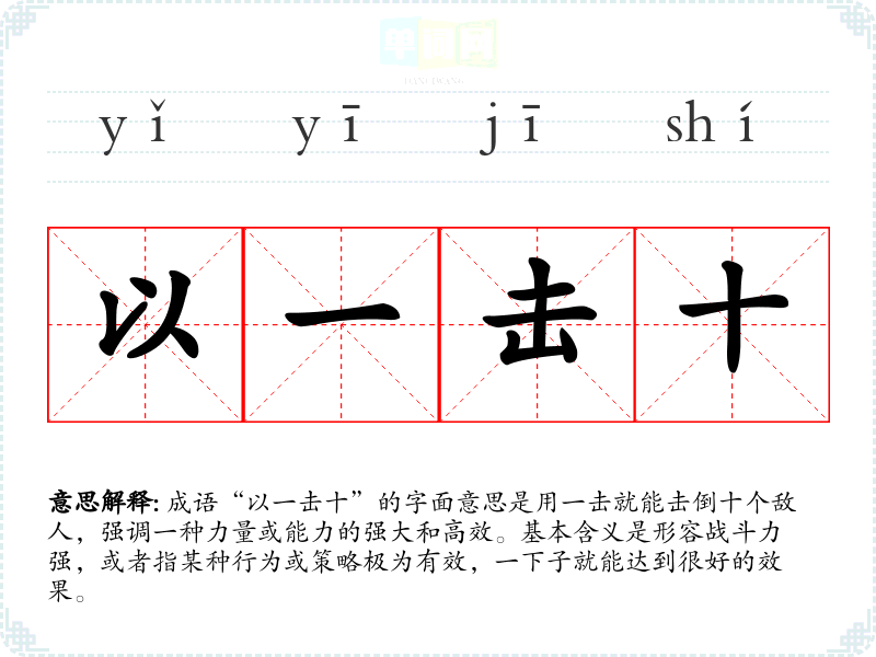 成语“以一击十”的字面意思是用一击就能击倒十个敌人,强调一种力量或能力的强大和高效。基本含义是形容战斗力强,或者指某种行为或策略极为有效,一下子就能达到很好的效果。