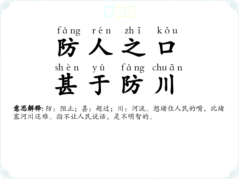 | 防人之口,甚于防川 | 防:阻止;甚:超过;川:河流。想堵住人民的嘴,比堵塞河川还难。指不让人民说话,是不明智的。 |