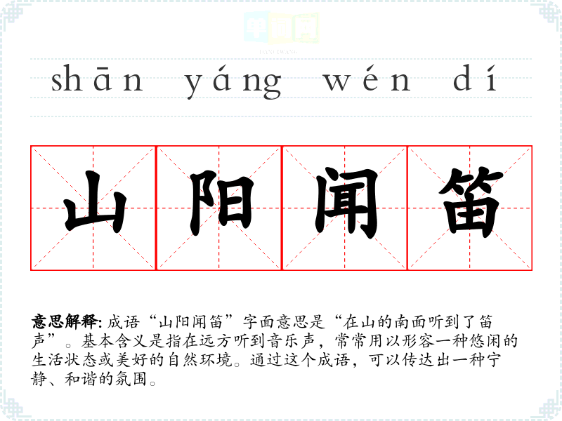 成语“山阳闻笛”字面意思是“在山的南面听到了笛声”。基本含义是指在远方听到音乐声,常常用以形容一种悠闲的生活状态或美好的自然环境。通过这个成语,可以传达出一种宁静、和谐的氛围。