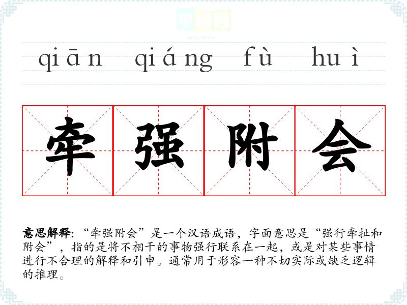 “牵强附会”是一个汉语成语,字面意思是“强行牵扯和附会”,指的是将不相干的事物强行联系在一起,或是对某些事情进行不合理的解释和引申。通常用于形容一种不切实际或缺乏逻辑的推理。