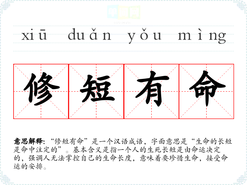 “修短有命”是一个汉语成语,字面意思是“生命的长短是命中注定的”。基本含义是指一个人的生死长短是由命运决定的,强调人无法掌控自己的生命长度,意味着要珍惜生命,接受命运的安排。