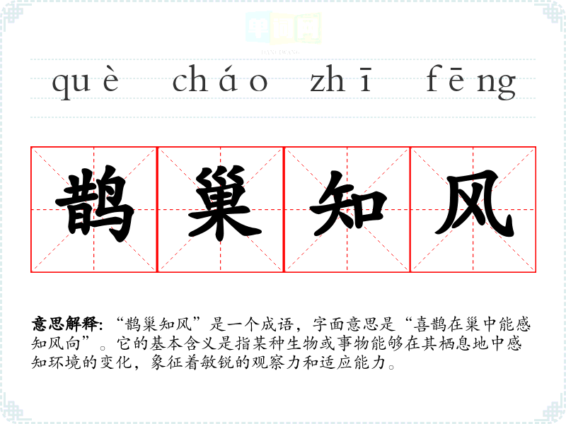 “鹊巢知风”是一个成语,字面意思是“喜鹊在巢中能感知风向”。它的基本含义是指某种生物或事物能够在其栖息地中感知环境的变化,象征着敏锐的观察力和适应能力。
