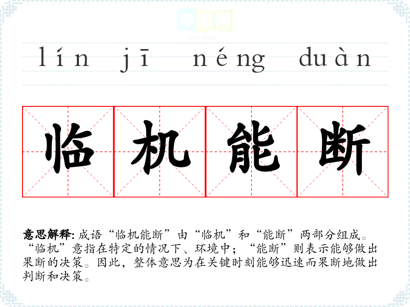 成语“临机能断”由“临机”和“能断”两部分组成。“临机”意指在特定的情况下、环境中;“能断”则表示能够做出果断的决策。因此,整体意思为在关键时刻能够迅速而果断地做出判断和决策。