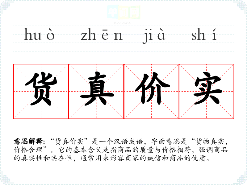 “货真价实”是一个汉语成语,字面意思是“货物真实,价格合理”。它的基本含义是指商品的质量与价格相符,强调商品的真实性和实在性,通常用来形容商家的诚信和商品的优质。