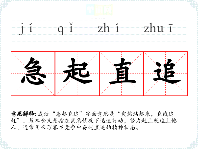 成语“急起直追”字面意思是“突然站起来,直线追赶”。基本含义是指在紧急情况下迅速行动,努力赶上或追上他人,通常用来形容在竞争中奋起直追的精神状态。