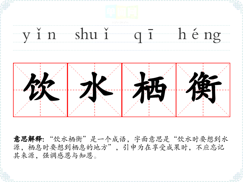 “饮水栖衡”是一个成语,字面意思是“饮水时要想到水源,栖息时要想到栖息的地方”,引申为在享受成果时,不应忘记其来源,强调感恩与知恩。