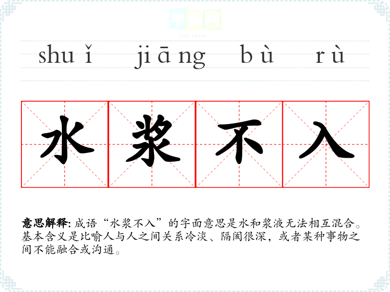 成语“水浆不入”的字面意思是水和浆液无法相互混合。基本含义是比喻人与人之间关系冷淡、隔阂很深,或者某种事物之间不能融合或沟通。