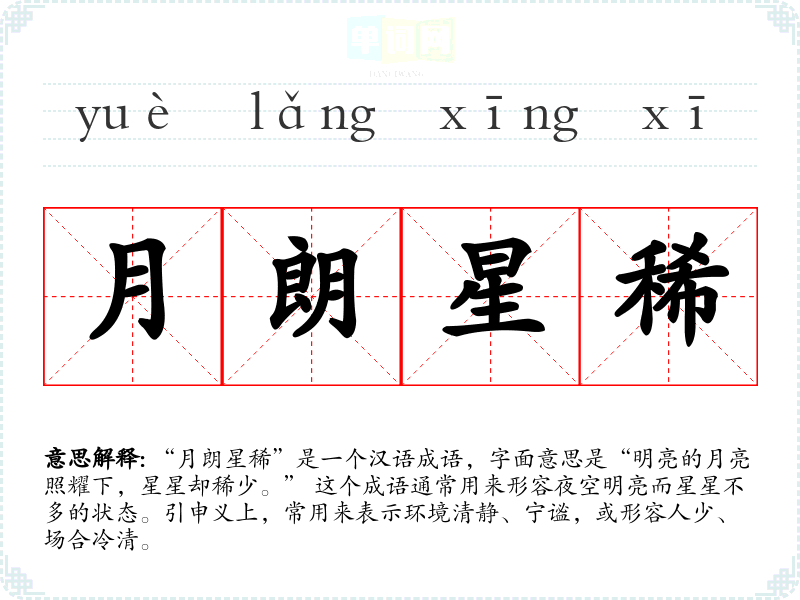 “月朗星稀”是一个汉语成语,字面意思是“明亮的月亮照耀下,星星却稀少。” 这个成语通常用来形容夜空明亮而星星不多的状态。引申义上,常用来表示环境清静、宁谧,或形容人少、场合冷清。