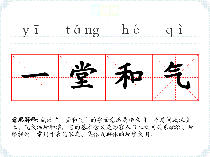 成语“一堂和气”的字面意思是指在同一个房间或课堂上,气氛温和和谐。它的基本含义是形容人与人之间关系融洽、和睦相处,常用于表达家庭、集体或群体的和睦氛围。