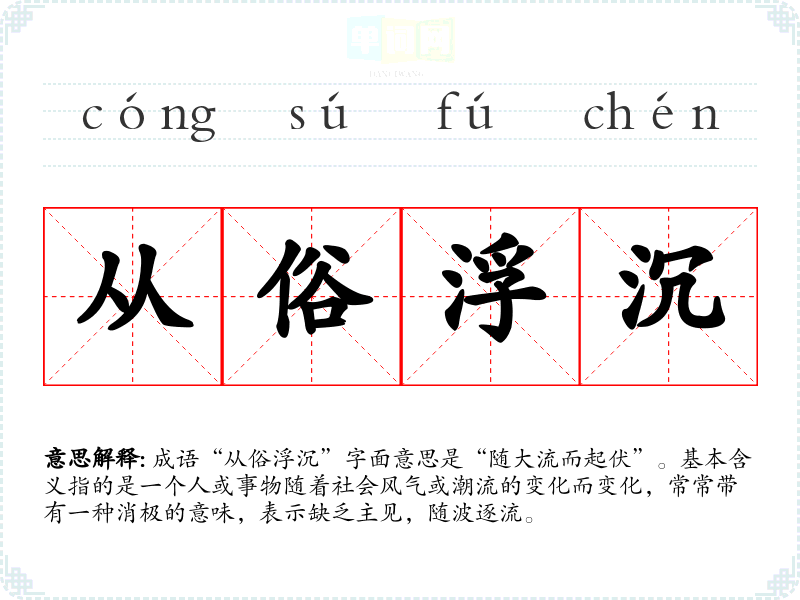 成语“从俗浮沉”字面意思是“随大流而起伏”。基本含义指的是一个人或事物随着社会风气或潮流的变化而变化,常常带有一种消极的意味,表示缺乏主见,随波逐流。