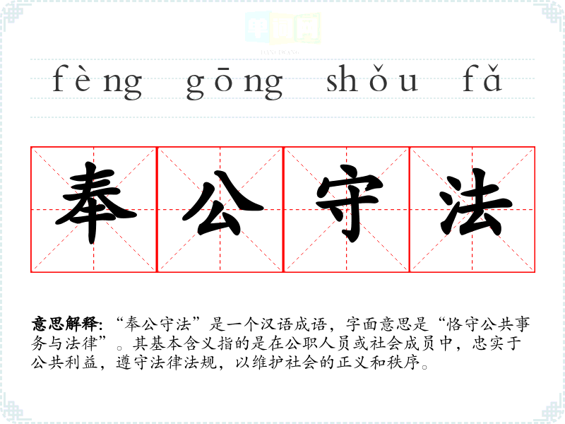 “奉公守法”是一个汉语成语,字面意思是“恪守公共事务与法律”。其基本含义指的是在公职人员或社会成员中,忠实于公共利益,遵守法律法规,以维护社会的正义和秩序。