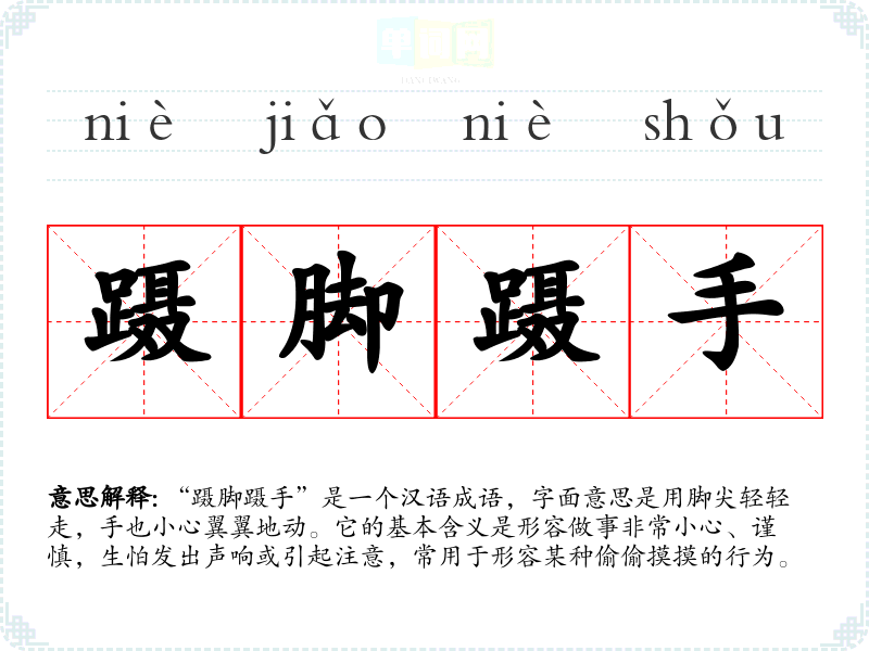 “蹑脚蹑手”是一个汉语成语,字面意思是用脚尖轻轻走,手也小心翼翼地动。它的基本含义是形容做事非常小心、谨慎,生怕发出声响或引起注意,常用于形容某种偷偷摸摸的行为。