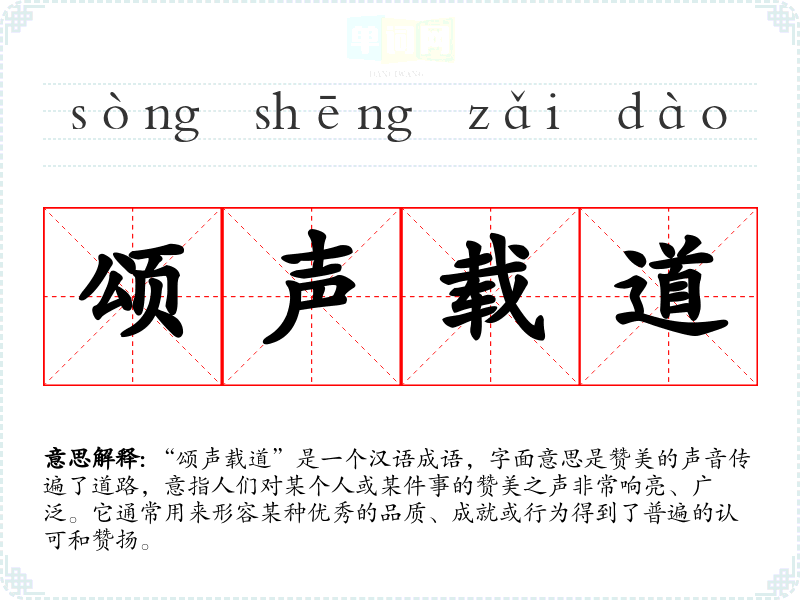 “颂声载道”是一个汉语成语,字面意思是赞美的声音传遍了道路,意指人们对某个人或某件事的赞美之声非常响亮、广泛。它通常用来形容某种优秀的品质、成就或行为得到了普遍的认可和赞扬。