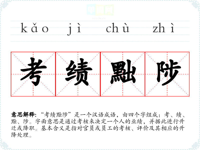 “考绩黜陟”是一个汉语成语,由四个字组成:考、绩、黜、陟。字面意思是通过考核来决定一个人的业绩,并据此进行升迁或降职。基本含义是指对官员或员工的考核、评价及其相应的升降处理。