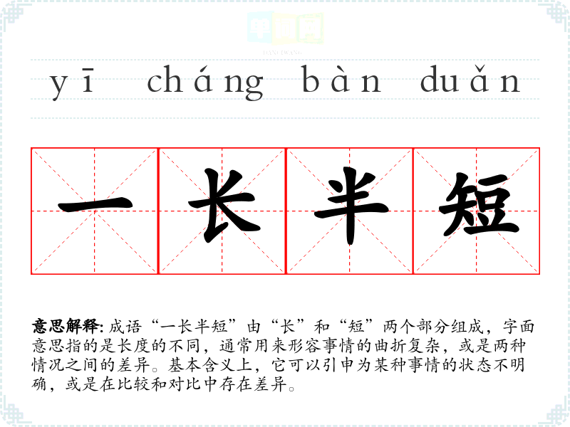 “一长半短”这一成语的具体来源并不明确,但其结构符合汉语的成语构成规律,通常被用来描述事物的多样性或复杂性。在古代文献中,类似的表述常常出现在对比和形容事物的上下文中。
