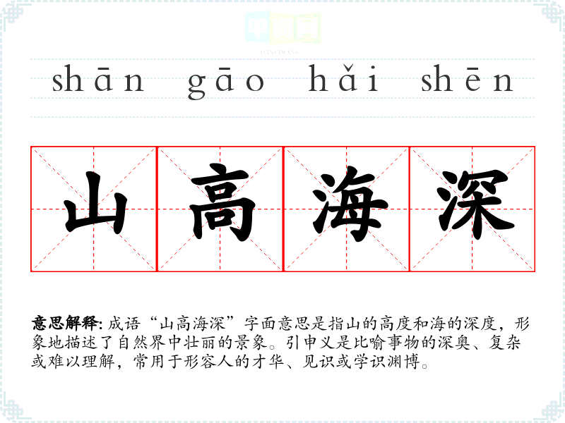 “山高海深”这一成语并没有明确的历史典故来源,但其概念可以追溯到古代文人对自然的敬畏与赞美。在古代诗词中,山与海常常用作比喻,表达宏伟与深邃的意象,代表着无限的可能与深远的思想。