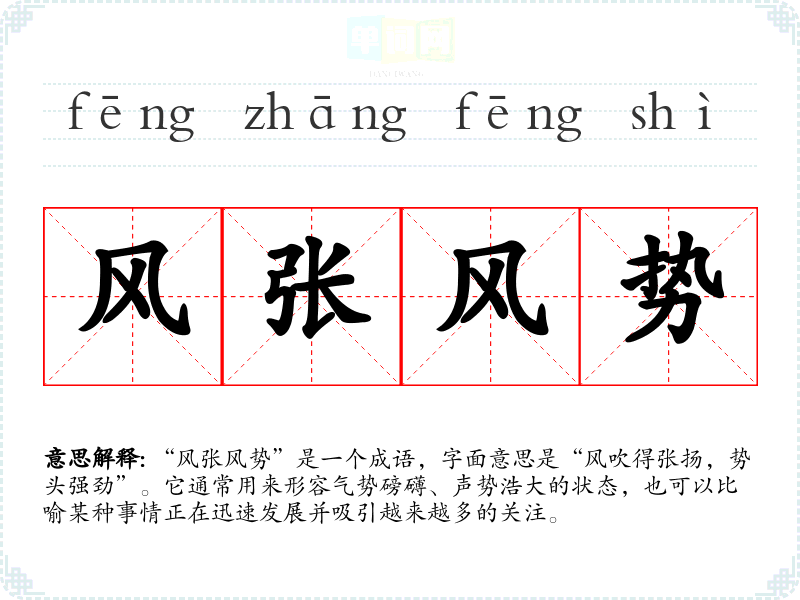 “风张风势”是一个成语,字面意思是“风吹得张扬,势头强劲”。它通常用来形容气势磅礴、声势浩大的状态,也可以比喻某种事情正在迅速发展并吸引越来越多的关注。