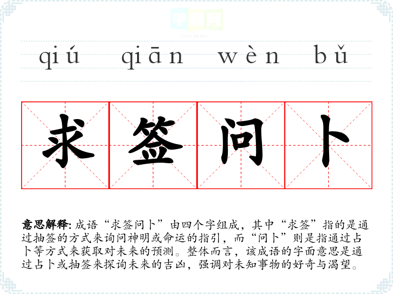 成语“求签问卜”由四个字组成,其中“求签”指的是通过抽签的方式来询问神明或命运的指引,而“问卜”则是指通过占卜等方式来获取对未来的预测。整体而言,该成语的字面意思是通过占卜或抽签来探询未来的吉凶,强调对未知事物的好奇与渴望。