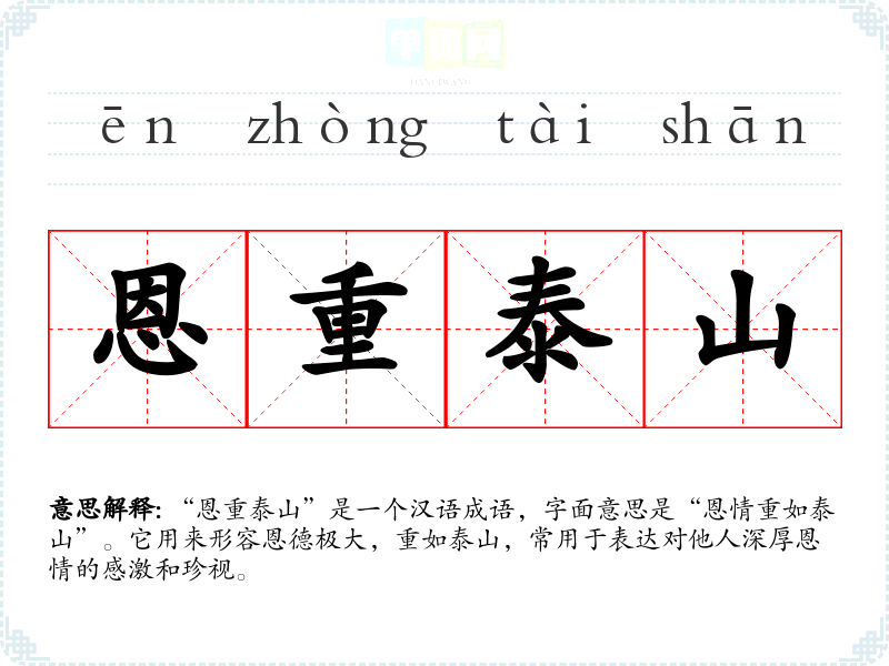 “恩重泰山”是一个汉语成语,字面意思是“恩情重如泰山”。它用来形容恩德极大,重如泰山,常用于表达对他人深厚恩情的感激和珍视。