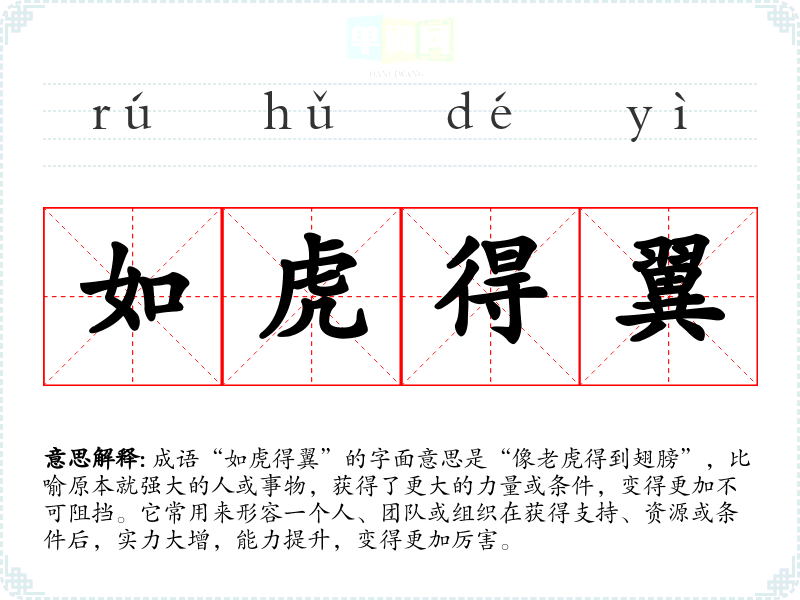 “如虎得翼”在**文化中,常用来鼓励人们在取得一定成就或支持后,继续努力,展现出更大的潜力。它强调了外部条件对个人或团队发展的重要性。在现代社会,该成语仍适用,尤其是在商业、体育和教育等领域。