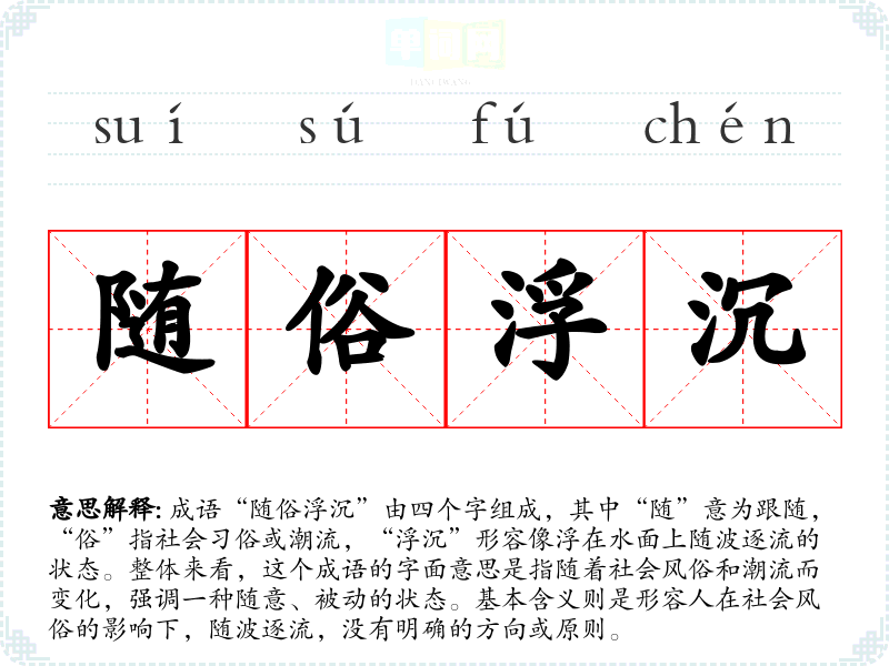 成语“随俗浮沉”由四个字组成,其中“随”意为跟随,“俗”指社会*俗或潮流,“浮沉”形容像浮在水面上随波逐流的状态。整体来看,这个成语的字面意思是指随着社会风俗和潮流而变化,强调一种随意、被动的状态。基本含义则是形容人在社会风俗的影响下,随波逐流,没有明确的方向或原则。