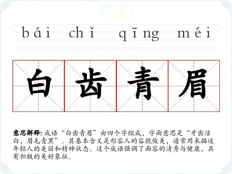成语“白齿青眉”由四个字组成,字面意思是“牙齿洁白,眉毛青黑”。其基本含义是形容人的容貌俊美,通常用来描述年轻人的美丽和精神状态。这个成语强调了面容的清秀与健康,具有积极的美好象征。