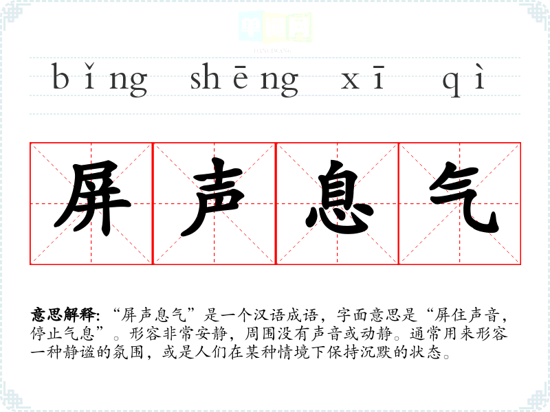 “屏声息气”是一个汉语成语,字面意思是“屏住声音,停止气息”。形容非常安静,周围没有声音或动静。通常用来形容一种静谧的氛围,或是人们在某种情境下保持沉默的状态。