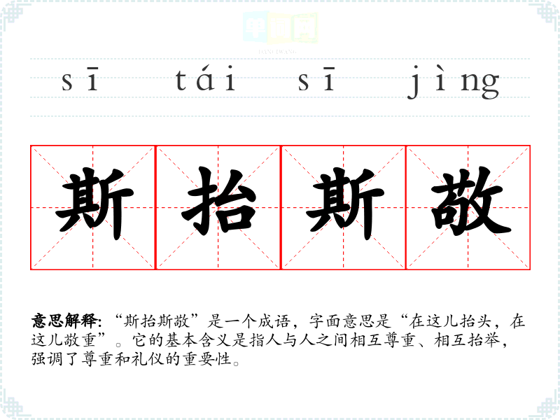 通过对“斯抬斯敬”的深入理解,我认识到,尊重不仅是个人修养的体现,也是社会和谐的重要因素。在我的语言学*和表达中,能够灵活运用这一成语,能够帮助我更好地与他人沟通,传达出尊重与理解的态度。