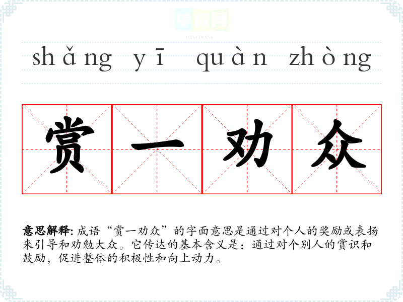 成语“赏一劝众”的字面意思是通过对个人的奖励或表扬来引导和劝勉大众。它传达的基本含义是:通过对个别人的赏识和鼓励,促进整体的积极性和向上动力。