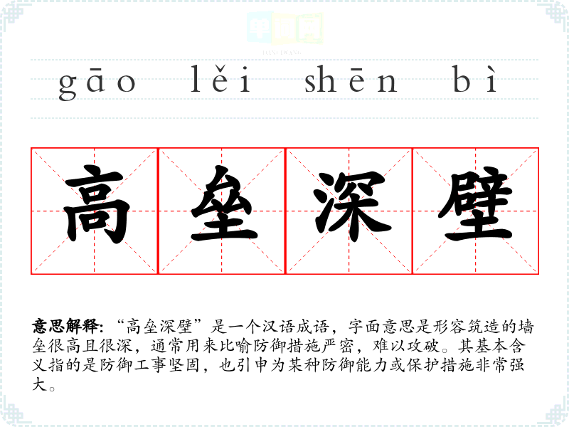 “高垒深壁”是一个汉语成语,字面意思是形容筑造的墙垒很高且很深,通常用来比喻防御措施严密,难以攻破。其基本含义指的是防御工事坚固,也引申为某种防御能力或保护措施非常强大。