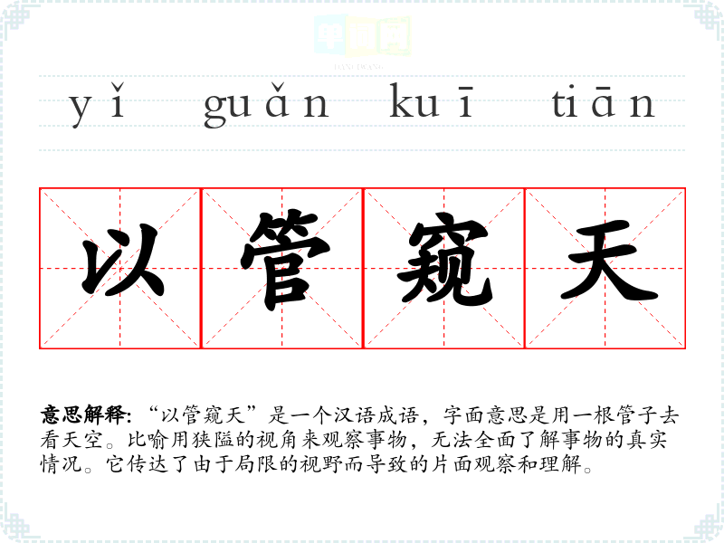 “以管窥天”让我联想到狭隘与局限,常常会让我反思自己的思维方式。它提醒我在思考问题时,应该尝试从多个角度去理解,而不是仅仅停留在表面或局部。