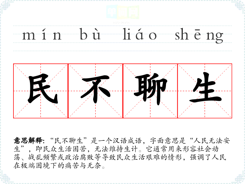 “民不聊生”是一个汉语成语,字面意思是“人民无法安生”,即民众生活困苦,无法维持生计。它通常用来形容社会动荡、战乱频繁或政治腐败等导致民众生活艰难的情形,强调了人民在极端困境下的痛苦与无奈。