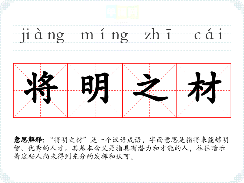 “将明之材”是一个汉语成语,字面意思是指将来能够明智、优秀的人才。其基本含义是指具有潜力和才能的人,往往暗示着这些人尚未得到充分的发挥和认可。