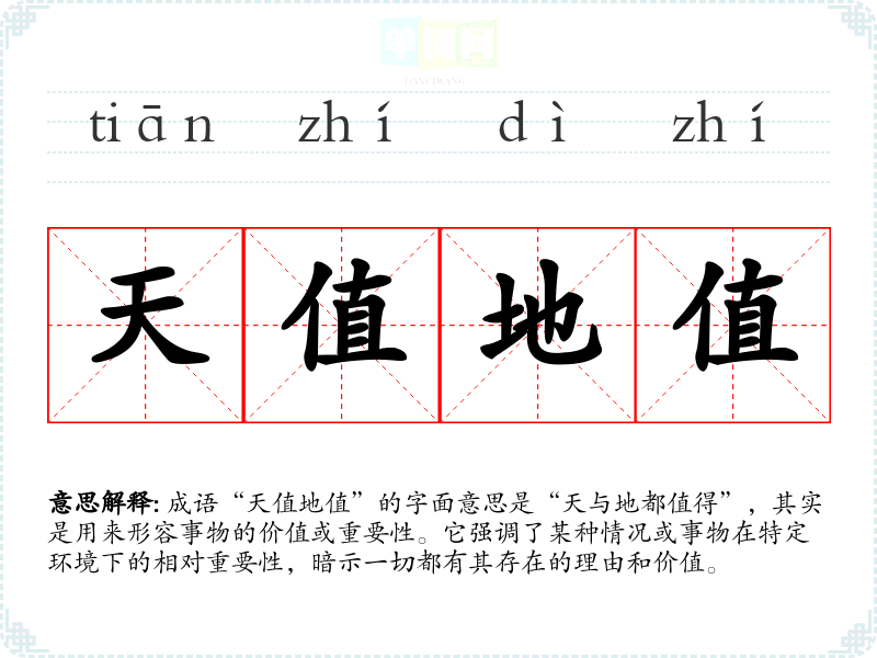 成语“天值地值”的字面意思是“天与地都值得”,其实是用来形容事物的价值或重要性。它强调了某种情况或事物在特定环境下的相对重要性,暗示一切都有其存在的理由和价值。