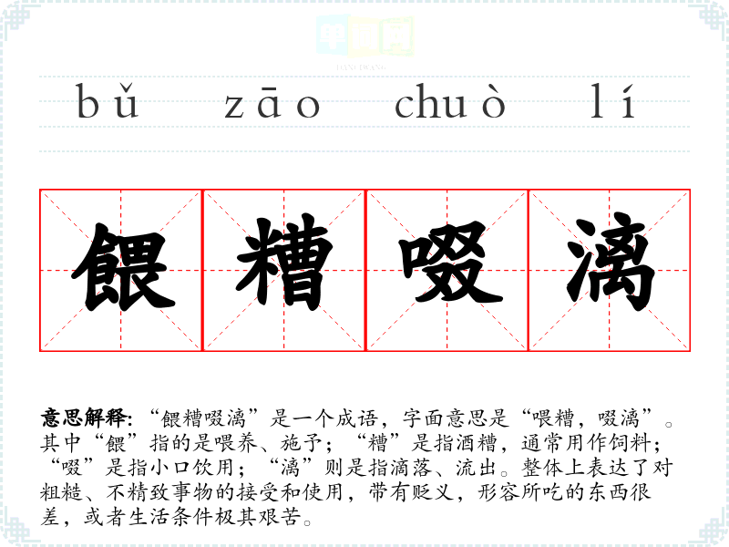 “餵糟啜漓”是一个成语,字面意思是“喂糟,啜漓”。其中“餵”指的是喂养、施予;“糟”是指酒糟,通常用作饲料;“啜”是指小口饮用;“漓”则是指滴落、流出。整体上表达了对粗糙、不精致事物的接受和使用,带有贬义,形容所吃的东西很差,或者生活条件极其艰苦。