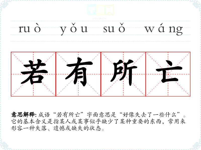 成语“若有所亡”字面意思是“好像失去了一些什么”。它的基本含义是指某人或某事似乎缺少了某种重要的东西,常用来形容一种失落、遗憾或缺失的状态。