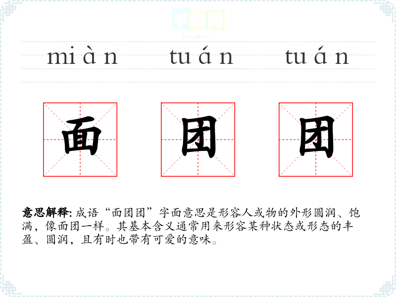 成语“面团团”字面意思是形容人或物的外形圆润、饱满,像面团一样。其基本含义通常用来形容某种状态或形态的丰盈、圆润,且有时也带有可爱的意味。