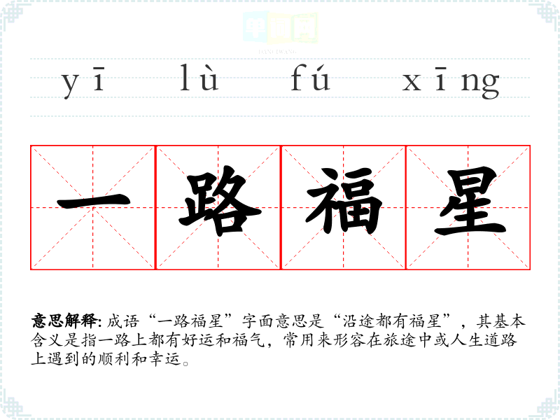 成语“一路福星”字面意思是“沿途都有福星”,其基本含义是指一路上都有好运和福气,常用来形容在旅途中或人生道路上遇到的顺利和幸运。