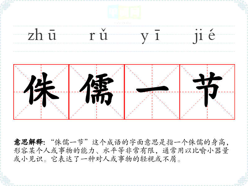 “侏儒一节”这个成语的字面意思是指一个侏儒的身高,形容某个人或事物的能力、水平等非常有限,通常用以比喻小器量或小见识。它表达了一种对人或事物的轻视或不屑。